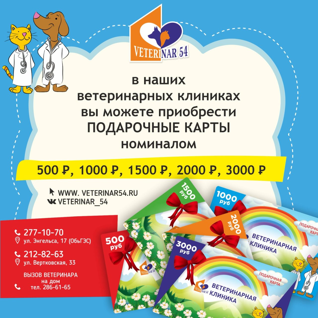 Какой подарок выбрать? Что подарить? Такие вопросы мы задаем себе каждый раз при выборе подарка. Компания ВЕТЕРИНАР 54 предлагает универсальный подарок, лучший подарок для владельцев домашних питомцев. Наши подарочные карты имеют широкий номинал от 500 рублей до 3000 рублей, а их комбинация может иметь безграничный номинал. с 01.10.2025 года в сети наших ветеринарных клиник Вы можете приобрести подарочную карту необходимого номинала и сделать лучший подарок для владельца домашнего любимца!!!