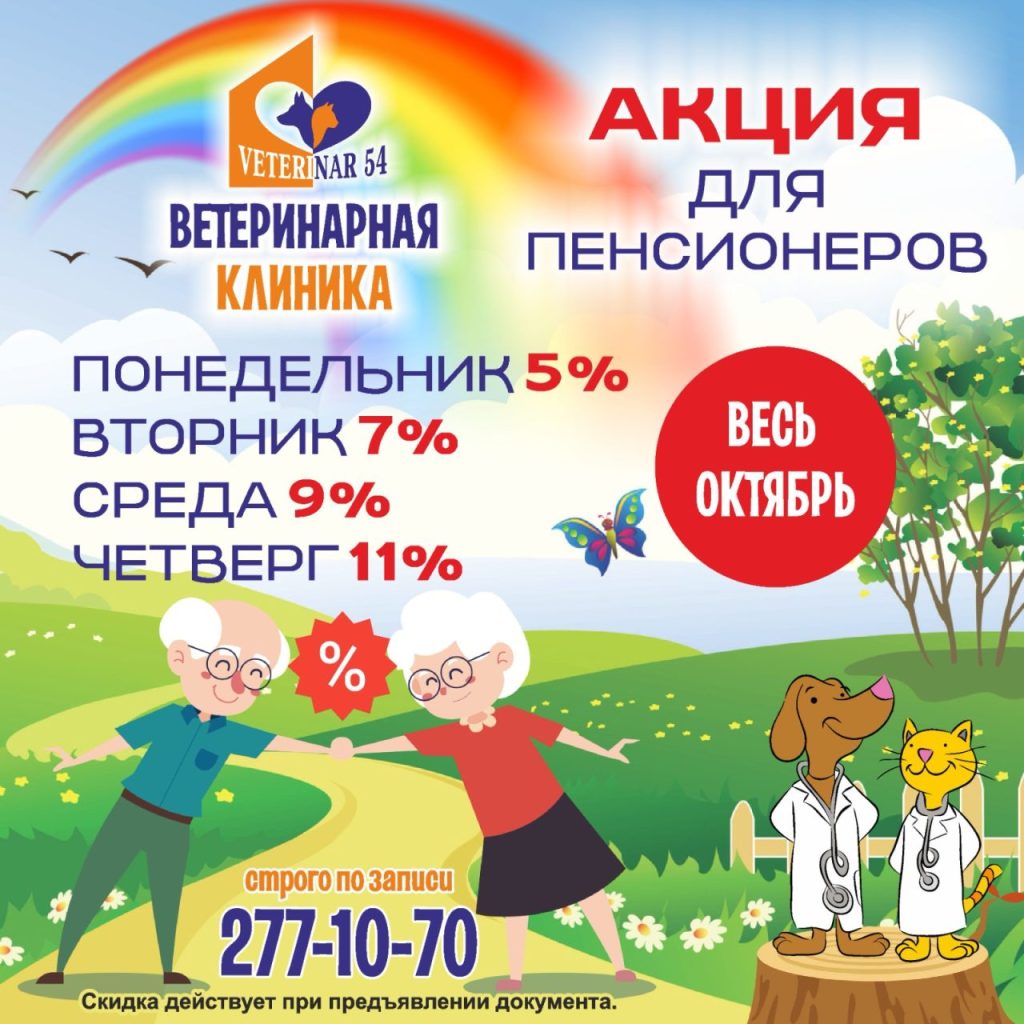 В период с 01.10.2025 г. по 31.10.2025 г. в сети наших ветеринарных клиник, где ежедневно совершают покупки и получают услуги люди преклонного возраста, появится возможность получить скидку до 11% на сумму чека, а так же дополнительный бонус, в виде подарочной карты постоянного покупателя с постоянной скидкой соответствующего номинала.